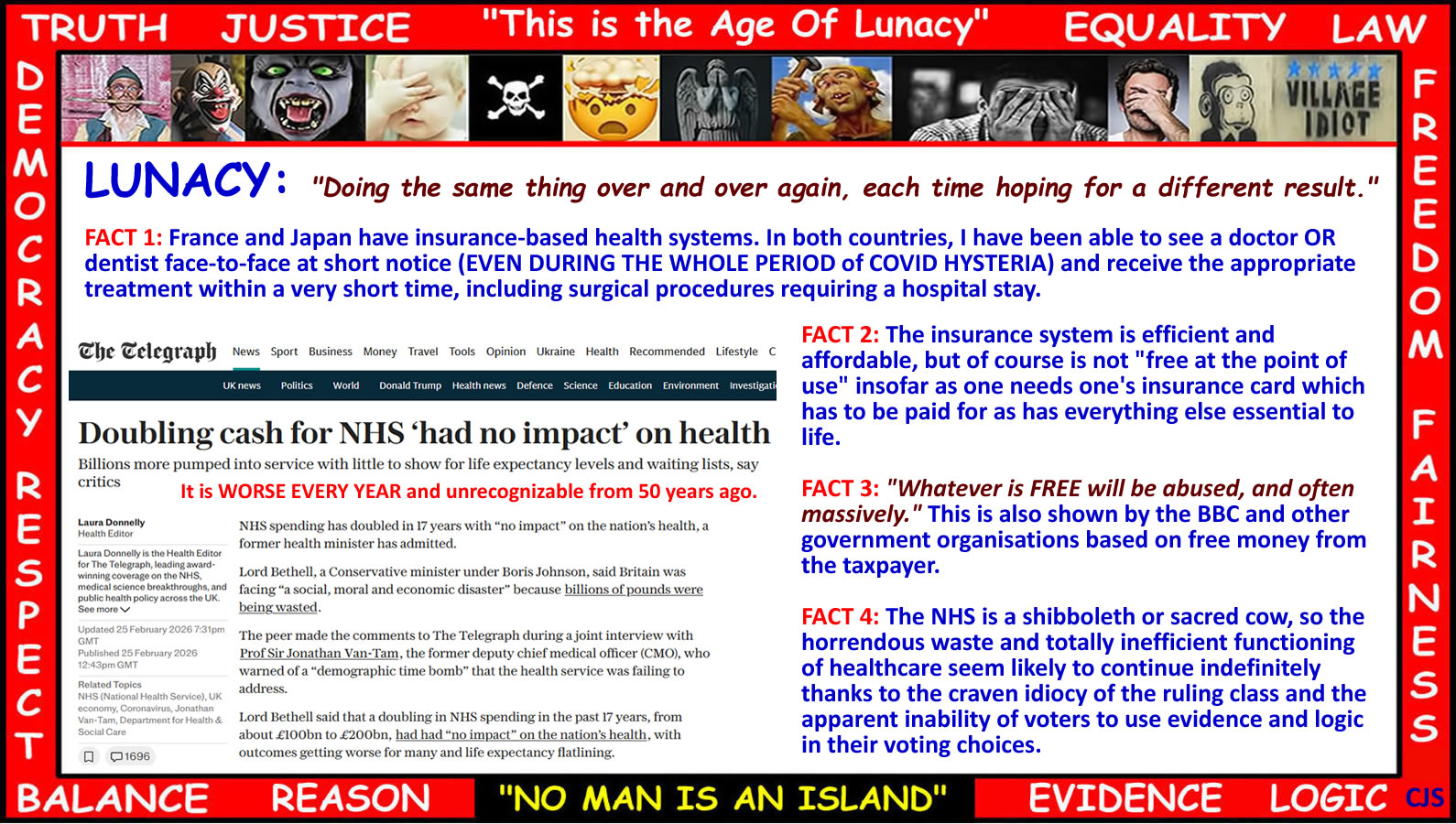 The THEORY of “free-at-the-point-of-treatment” is fine, but the REALITY DOES NOT WORK. We live in a REAL WORLD not a THEORETICAL ONE. Anything else is just chickening out as has been done for decades and which has got us into this disaster - at which most people seem to be (AS USUAL) just shrugging their shoulders and demanding more money. |