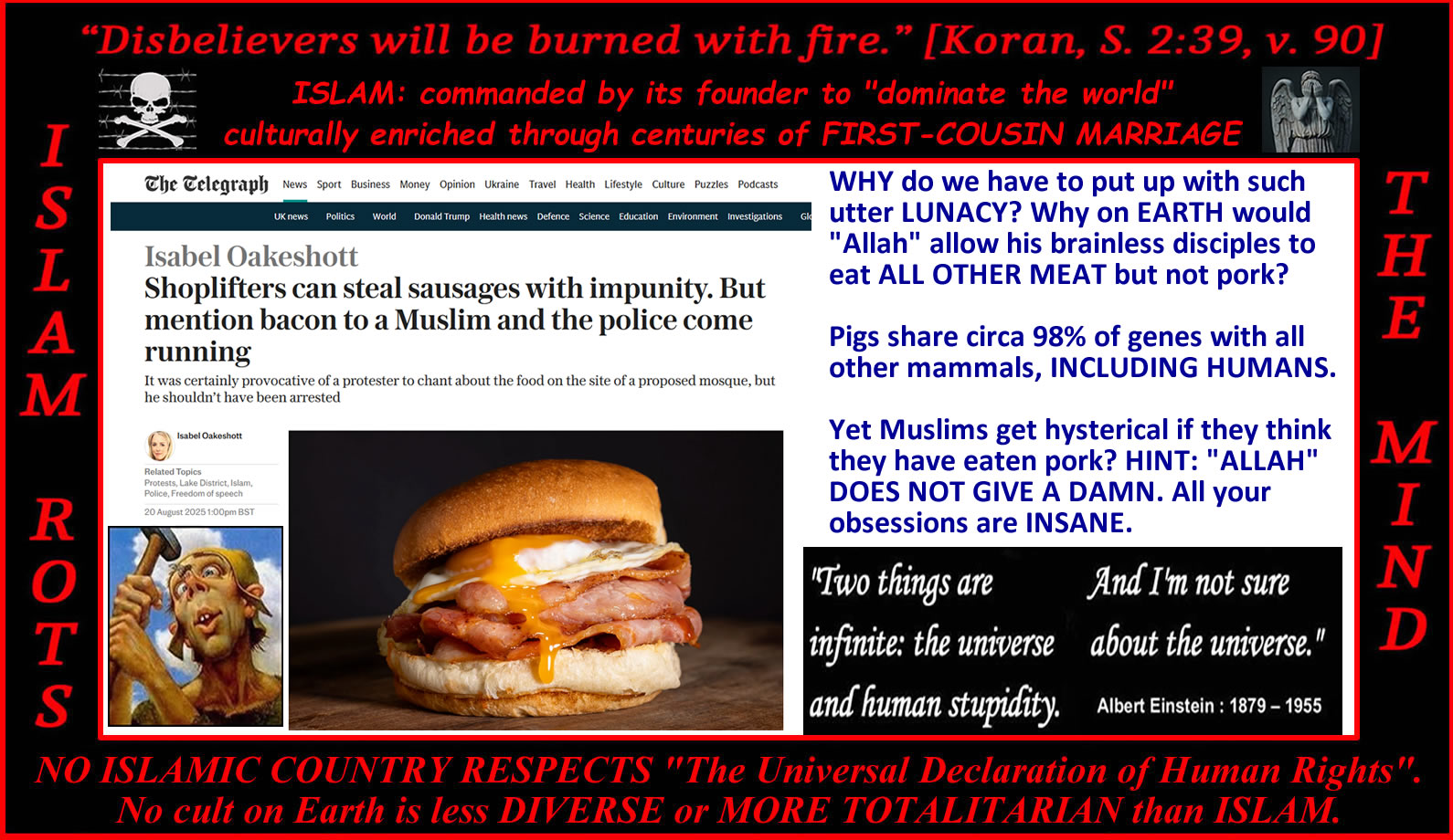 Pork is prohibited in Qur’an: “Forbidden to you (for food) are: dead meat, blood, the flesh of swine, and that on which hath been invoked the name of other than Allah.” [Al-Qur’an 5:3] The above verses of the Holy Qur’an are sufficient to satisfy a Muslim as to why pork is forbidden. |