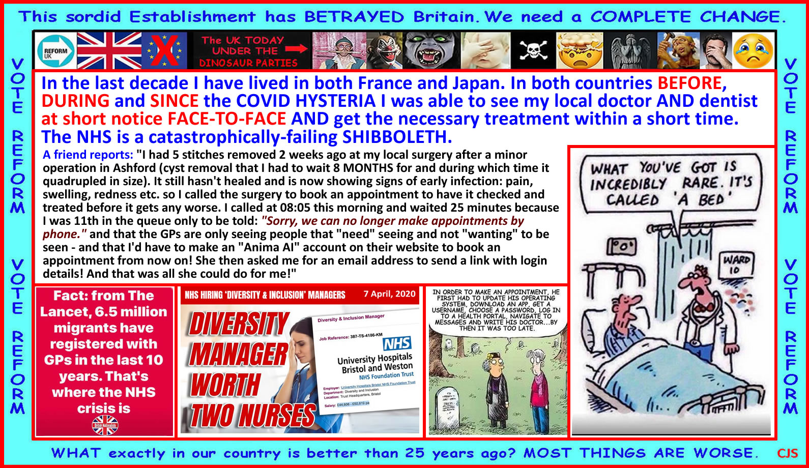 THIS is the reason for this crisis; REAL CHANGE is impossible because the NHS is a SHIBBOLETH which CAN NEVER WORK AS IT WAS SET UP, but which NOBODY has the guts to reform.
